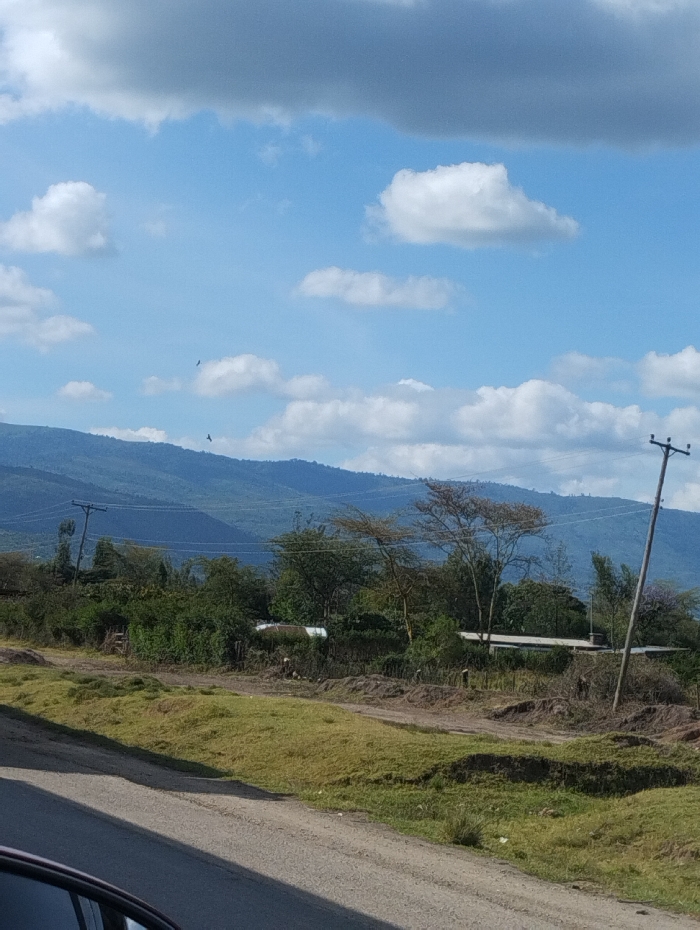 The image depicts a rural or semi-rural landscape within Mosop ward, Kenya, under a clear blue sky dotted with scattered white cumulus clouds. In the foreground, the edge of a paved road is visible on the lower left, with a dark frame suggesting the perspective from inside a vehicle. Adjacent to the paved road, a strip of green grass gives way to an unpaved dirt area containing several mounds of dark brown earth or debris. Beyond this, a dense line of diverse vegetation, including green bushes and trees, extends horizontally across the midground. One tall, light-colored utility pole with associated lines stands on the right side of the frame. Further left, another utility pole is partially obscured by trees. Faint, light-colored horizontal structures, possibly parts of buildings or shelters, are partially visible amidst the vegetation in the distance. The background features a prominent range of hills or mountains, appearing dark green to blue, spanning the horizon. Two small, dark bird-like shapes are discernible in flight against the sky in the upper left quadrant. No individuals are visible.