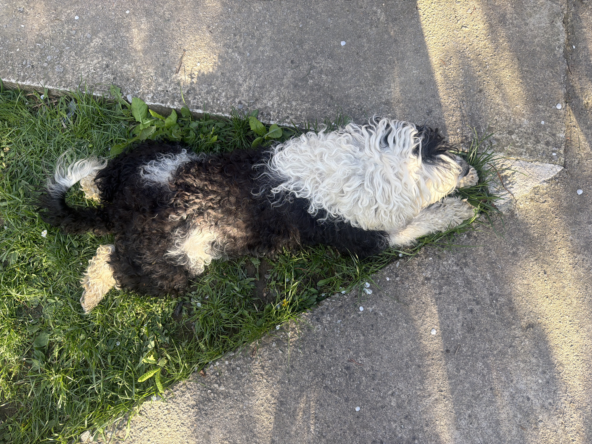 A black and white dog is lying on its side on the grass next to a concrete sidewalk. The dog's fur is long and curly. The grass is green and mixed with weeds. The concrete sidewalk is gray and textured. The photograph was taken outdoors on a sunny day in Vladaya, Bulgaria.