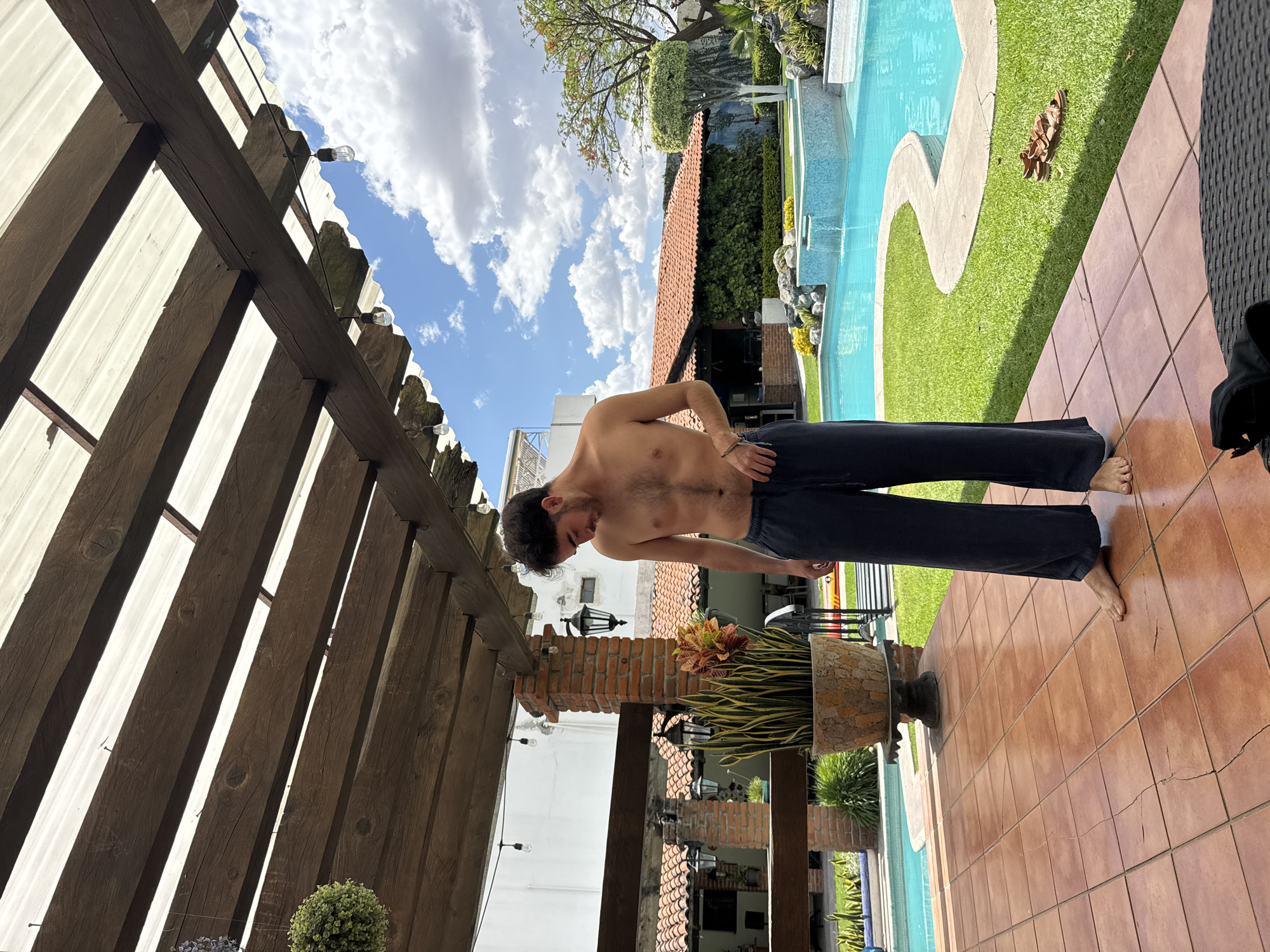A slightly high-angle, outdoor shot depicts a shirtless man with dark hair and pants standing on a terracotta-tiled patio