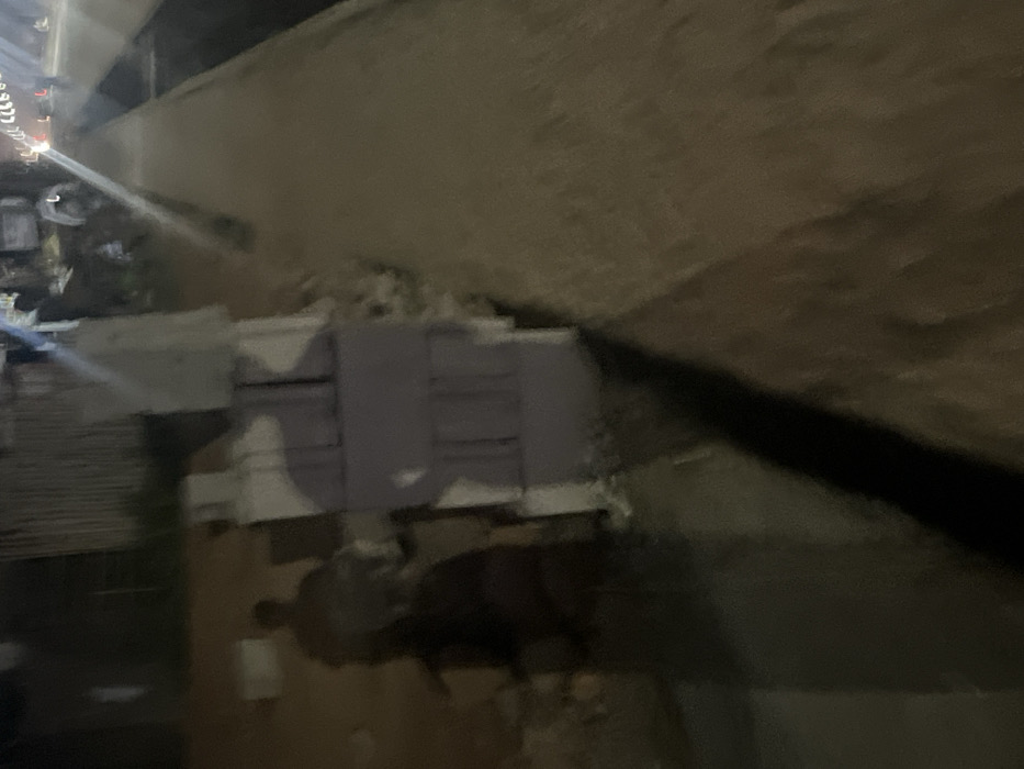 A blurry and dark image displays an outdoor setting at night. To the left, blurry lights suggest a street. A pile of materials, possibly construction-related, is in the foreground. Adjacent to it, a dark shape with lighter patches could be a vehicle or some kind of equipment. A large, light-colored wall or surface occupies much of the background. A dark shadow stretches across the scene from the upper right, contributing to the image's overall murkiness.