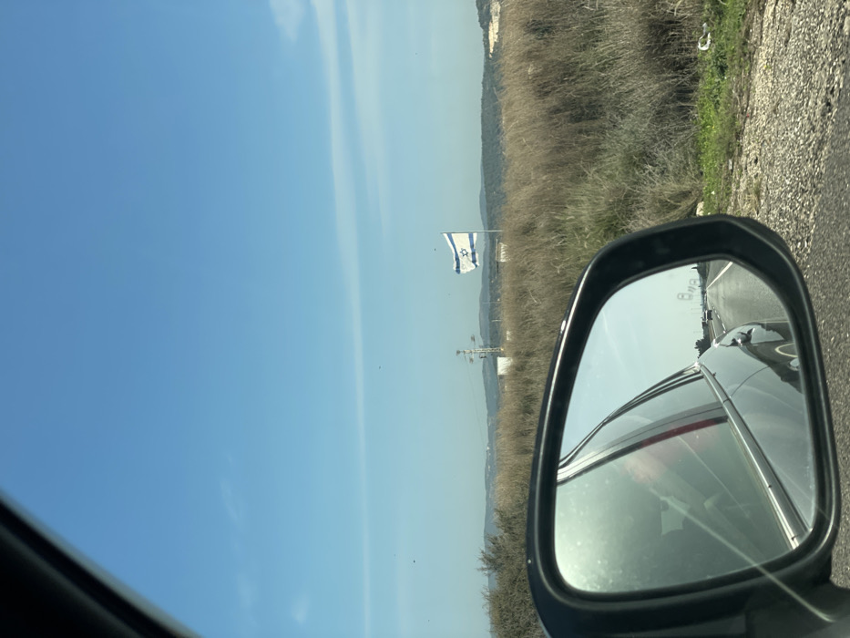 The scene is situated in Hof HaCarmel Regional Council, Israel. The image is captured from inside a vehicle, looking towards the right. A black vehicle side mirror occupies the lower-left quadrant, reflecting a multi-lane highway with a faint white dividing line and distant vehicles. A dark window frame is partially visible along the left edge. The landscape immediately beyond the vehicle consists of a field of tall, dry, light-brown grasses and scrub, bordering a rough, dark ground surface on the far right. In the mid-distance, a white and blue Israeli flag with a blue Star of David is flying from a pole, oriented to the left by wind. A metallic lattice structure, likely a power or communication pole, is positioned to the left of the flag. A line of vegetated rolling hills forms the horizon. The sky above is clear and bright blue, featuring minimal scattered clouds and several small, dark specks, possibly birds. No individuals are directly visible. The vehicle appears to be stationary or moving slowly on the side of a road, with traffic visible in the rear-view mirror reflection.