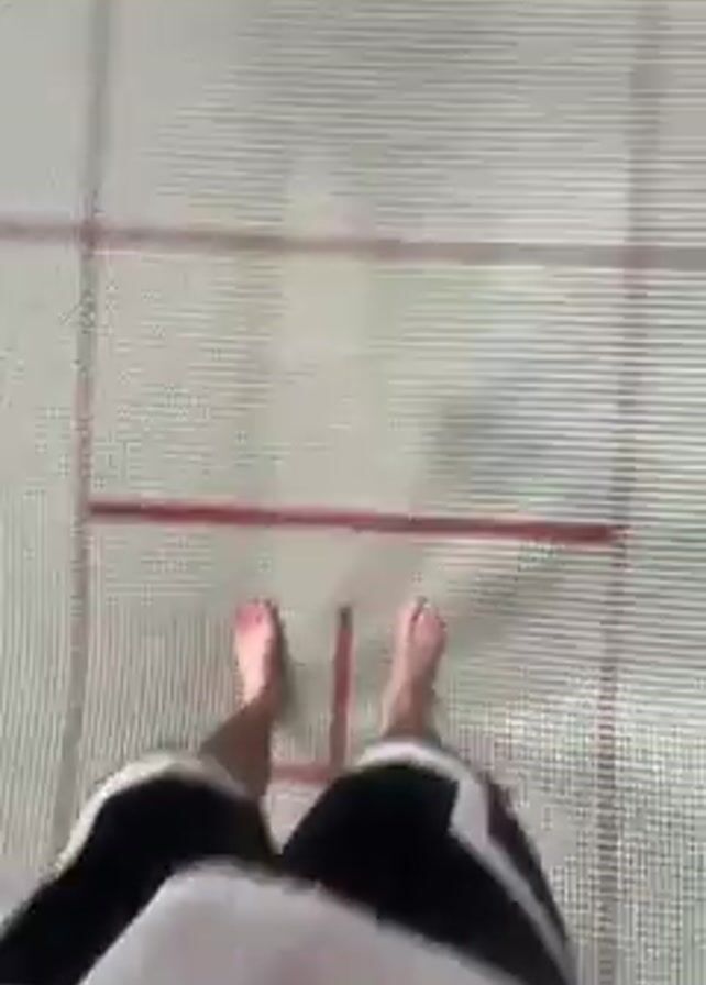 A first-person perspective video shows a person stepping onto a trampoline. The person is wearing black and white shorts. The trampoline is a light color with red borders and red lines creating a grid pattern. The person’s bare feet are visible as they walk on the trampoline. Loud music is audible in the background.