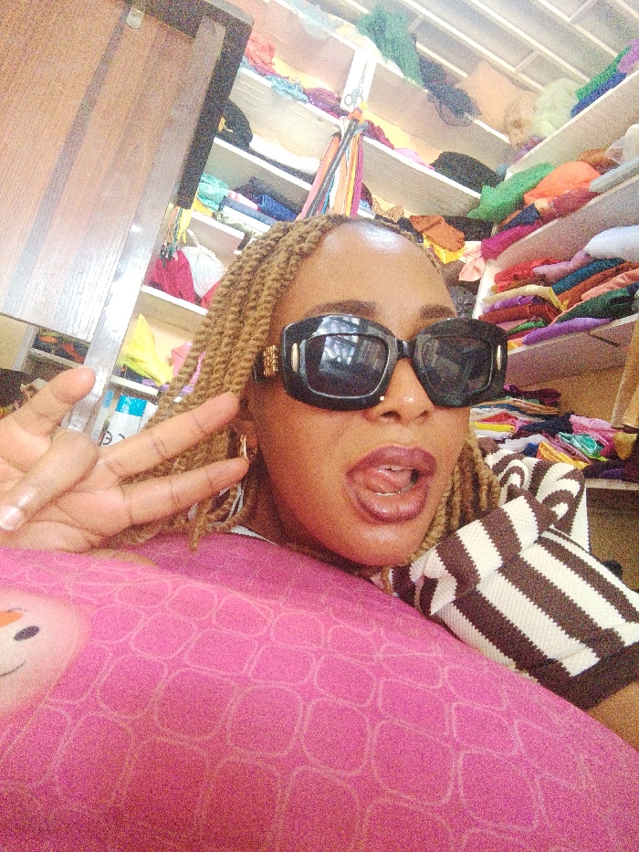 A woman with light brown braided hair, wearing large black sunglasses with gold accents and dark red lipstick, is depicted in a medium close-up view. Her lips are parted, with her tongue slightly extended. Her left hand is raised, making a 'peace' sign with the index and middle fingers. A gold-colored hoop earring is visible on her left ear. She is partially obscured by a bright pink object, possibly a cushion or pillow, featuring a faint grid pattern and a partial cartoon face on the far left. A brown and white striped fabric is visible on her right side. The background consists of shelves stacked with numerous folded or rolled colorful textiles in various hues, suggesting an indoor setting such as a fabric store or storage area. A dark wooden structure is present on the far left background. The scene is located in Sabon Tasha, Nigeria.