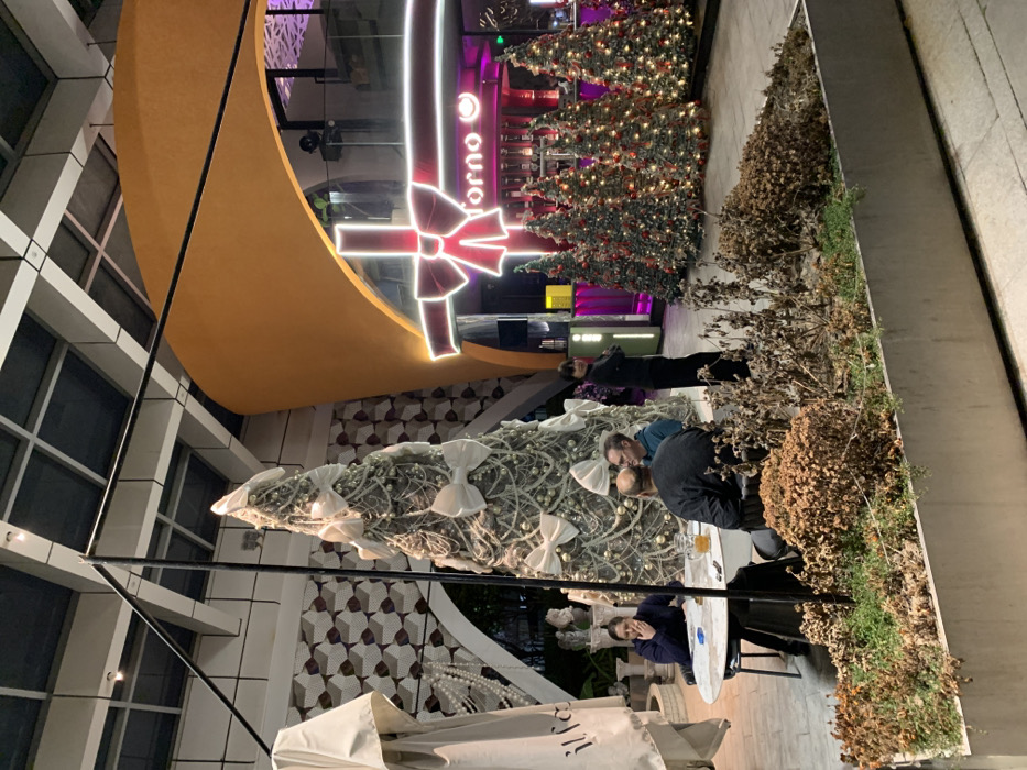 The image depicts a nighttime scene in an outdoor or semi-enclosed commercial area within Xiaoshan District, China. The environment features an overhead grid ceiling structure and a large, curved orange architectural element on the right. In the foreground, a rectangular planter box contains dried, brown foliage with sparse green growth. A large, conical structure, resembling a Christmas tree, dominates the left-center, adorned with numerous white bows and strings of white beads or lights. To its right, a bar entrance is marked by a bright neon sign in the shape of a red gift bow with white ribbon accents, illuminating the word "forno." Behind this sign, a bar area is visible with bottles and pink/purple lighting, flanked by several smaller, illuminated artificial Christmas trees decorated with white and red lights. Four individuals are seated around a round, white table to the left. One woman, dressed in dark clothing, is seated on the far left, holding an object to her mouth. Three men occupy the remaining seats, with two having their backs to the camera and one man in a teal shirt partially facing right. A glass mug containing a light-colored beverage is on the table. To the right of the large central tree, a woman with short dark hair, dressed in black, stands upright, looking towards the seated group. On the far left, a folded white fabric awning or umbrella is visible. A dark metal framework extends vertically and horizontally through the upper-mid section of the scene. In the background on the far left, a patterned wall, an arched opening, and classical statuary are partially visible.