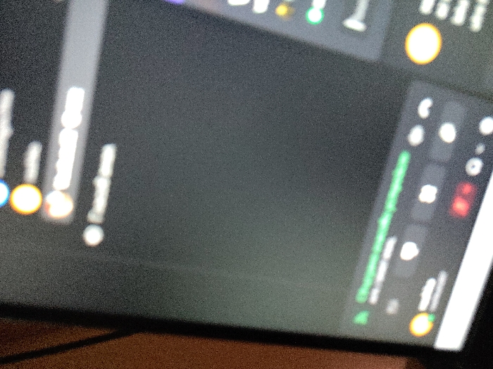 In Krushare, Bulgaria, a digital display, likely a monitor or laptop screen, is depicted at an oblique angle. The screen presents a dark gray interface, consistent with a "dark mode" application. Interface elements are heavily blurred due to focus and low resolution. The upper left quadrant of the screen shows indistinct rows, including a blurred header that partially reads "Известия" (Notifications), followed by circular icons (one yellow/orange, one red, one white) and associated blurred text, suggesting user profiles or communication threads. The lower left area displays a horizontal green banner with blurred text, beneath which are more blurred interface components, including a circular yellow/orange icon, vague text, and several small, mostly white, control or reaction icons, one of which is distinctly red. Along the right edge of the screen, a vertical column of blurred circular icons (green and yellow/orange) and numerical or textual indicators is visible, consistent with a status list or sidebar. A dark, possibly wooden, surface borders the screen on the far left. No individuals or specific actions are identifiable within the frame. The overall scene is dimly lit.