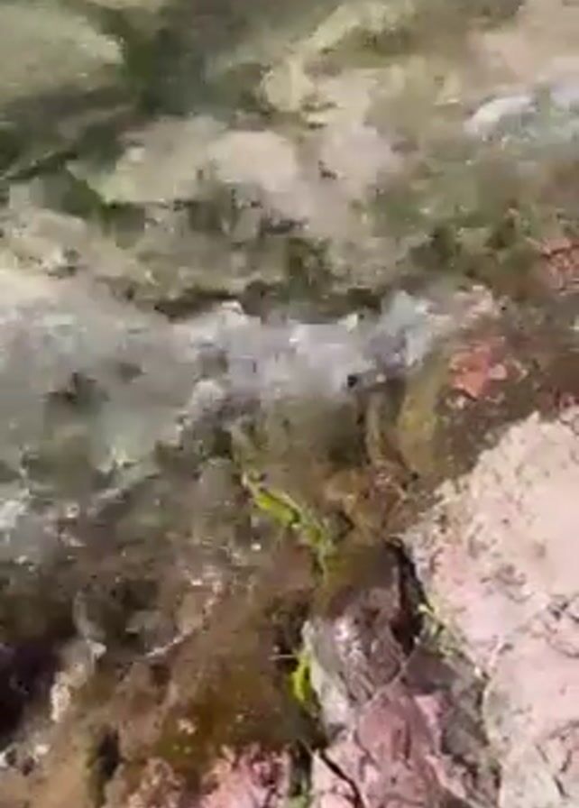 close-up view of a small stream flowing over rocks. The water is clear and moves quickly, creating small splashes and ripples. The rocks are a mix of colors, including red, brown, and green, some are covered with moss or algae. The overall scene is natural and peaceful, suggesting a tranquil outdoor environment.