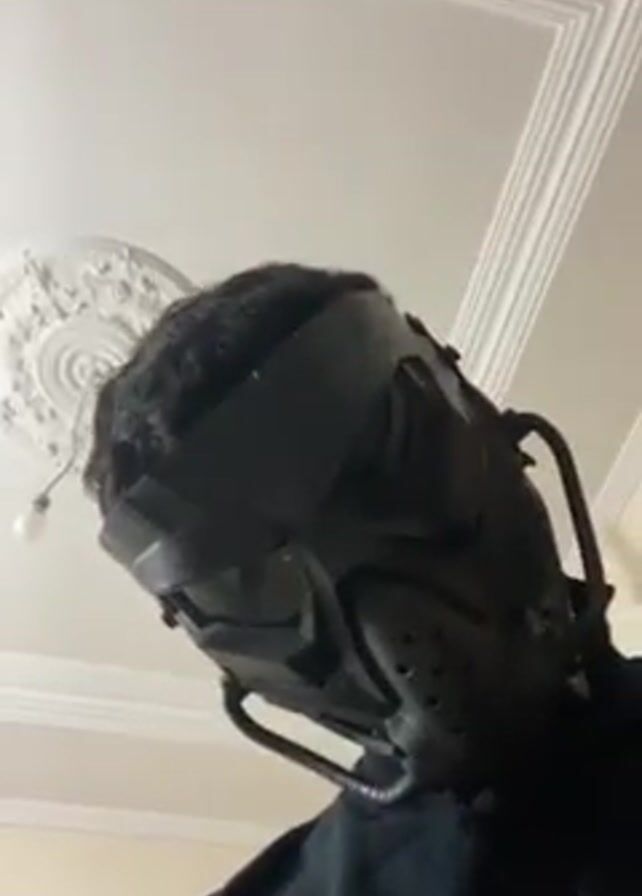person wearing a dark mask. The mask covers the person’s face and head, and has a visor, tubes, and vents. The person is indoors, standing under a white ceiling with a decorative medallion. The person holds up a long, thin metal blade. The blade is shiny and has a pointed tip. The person holds the blade in front of them, then moves it to the side.