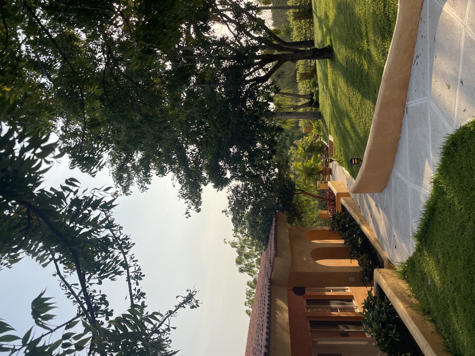 A sun-drenched outdoor scene features a terracotta-roofed building with arched doorways, surrounded by manicured grass and a winding stone path. Lush greenery, including mature trees, overhangs the area. Shadows fall across the landscape, suggesting late afternoon or early morning light. A stone barrier borders the path, separating it from the verdant lawn. The scene evokes a sense of tranquility and natural beauty.