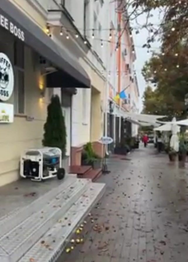 The camera films a wet, brick-paved sidewalk next to a building that houses “Coffee Boss”. A portable generator is parked in front of the store’s door. The sidewalk is covered with fallen leaves and a few small, yellow fruits. In the background, there’s a street with other businesses, visible through awnings and umbrellas. A woman in a red jacket walks down the street in the distance. A Ukrainian flag hangs from one of the buildings. String lights stretch along the buildings, adding some brightness to the overcast day.