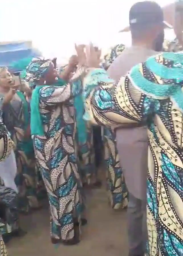 A group of women are dancing at an outdoor event. The women are all wearing matching outfits consisting of a long dress and headwrap with a teal, tan, and black leaf pattern. Some of them are also wearing teal scarves. The women are surrounded by other people, including a man wearing a baseball cap. There are buildings and a white tent visible in the background. The women appear to be enjoying themselves as they dance and raise their hands in the air.