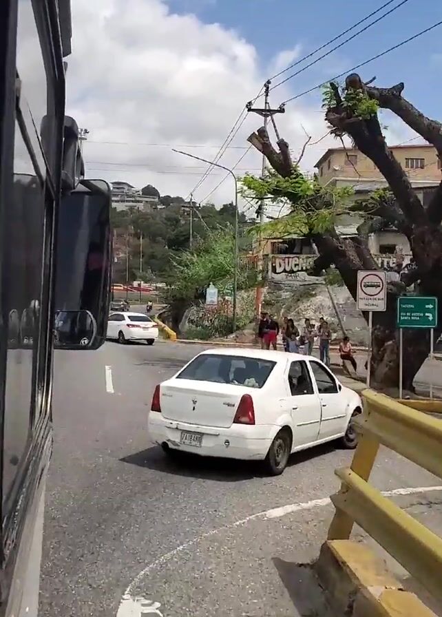 The video, taken from a moving bus, shows a street scene on a sunny day. The bus is on a road with a yellow guardrail separating it from the sidewalk. On the sidewalk, a group of people, mostly young, are standing around. Some are standing near the curb. One woman is seated on the curb. There is a white car driving on the road. A building with graffiti that reads "DUENOS DE ORO" is visible behind the group of people, up on a slight hill. Overhead, electrical wires run along poles. The sky is blue with scattered clouds.