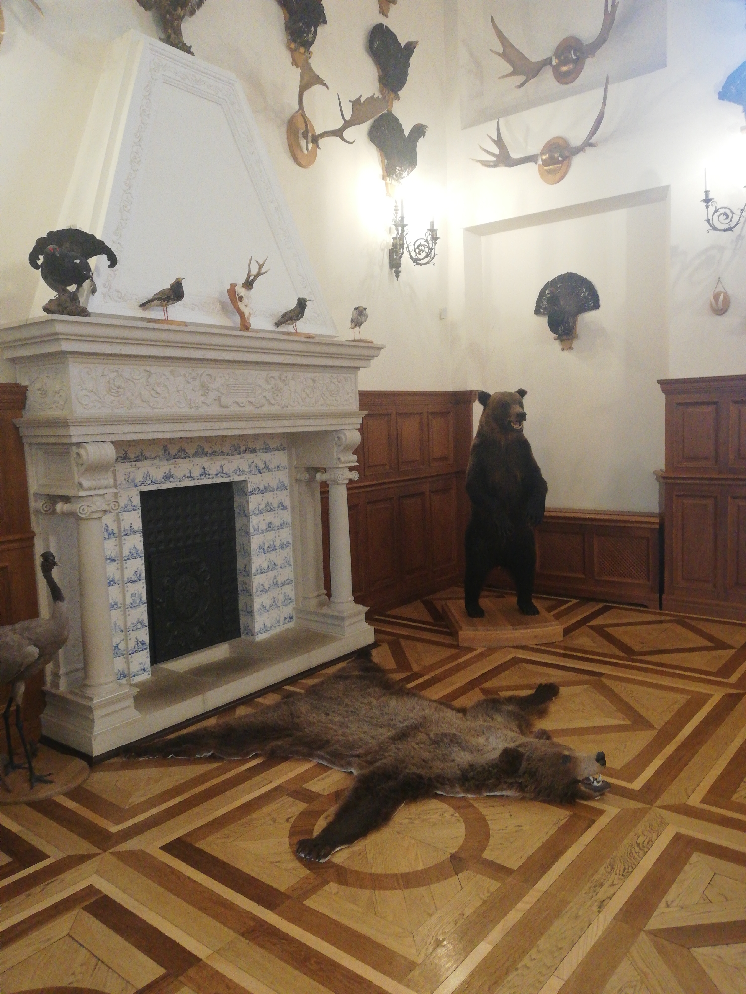 The image portrays a grand room, identified as being within Nesvizh Castle in Nyasvizh, Belarus. The room features light-colored walls, dark wooden wainscoting, and an ornate parquet floor composed of light and dark wood in geometric patterns. A large, white, elaborately carved stone fireplace, adorned with blue and white tiled panels depicting maritime scenes, is prominent on the left. The fireplace mantel displays several taxidermied small birds and a deer skull with antlers. Above the fireplace, a tall, white, pyramidal hood is present. Taxidermied animals are a central feature of the room. A large, dark brown bear stands upright on a low wooden pedestal on the right side of the image, with its mouth slightly ajar. In the foreground, centered on the floor, lies a brown bear skin rug with the head intact and mouth open, revealing teeth. To the far left, a tall, grey, long-legged bird, possibly a crane or heron, stands on a round wooden base. The walls are extensively decorated with multiple mounted taxidermy specimens, including several sets of deer antlers with skull plates, and various taxidermied game birds, some displayed as full mounts and others as fanned tails, affixed to wooden plaques. Two ornate dark metal wall sconces, each with two candle-like fixtures, are mounted on the left wall.