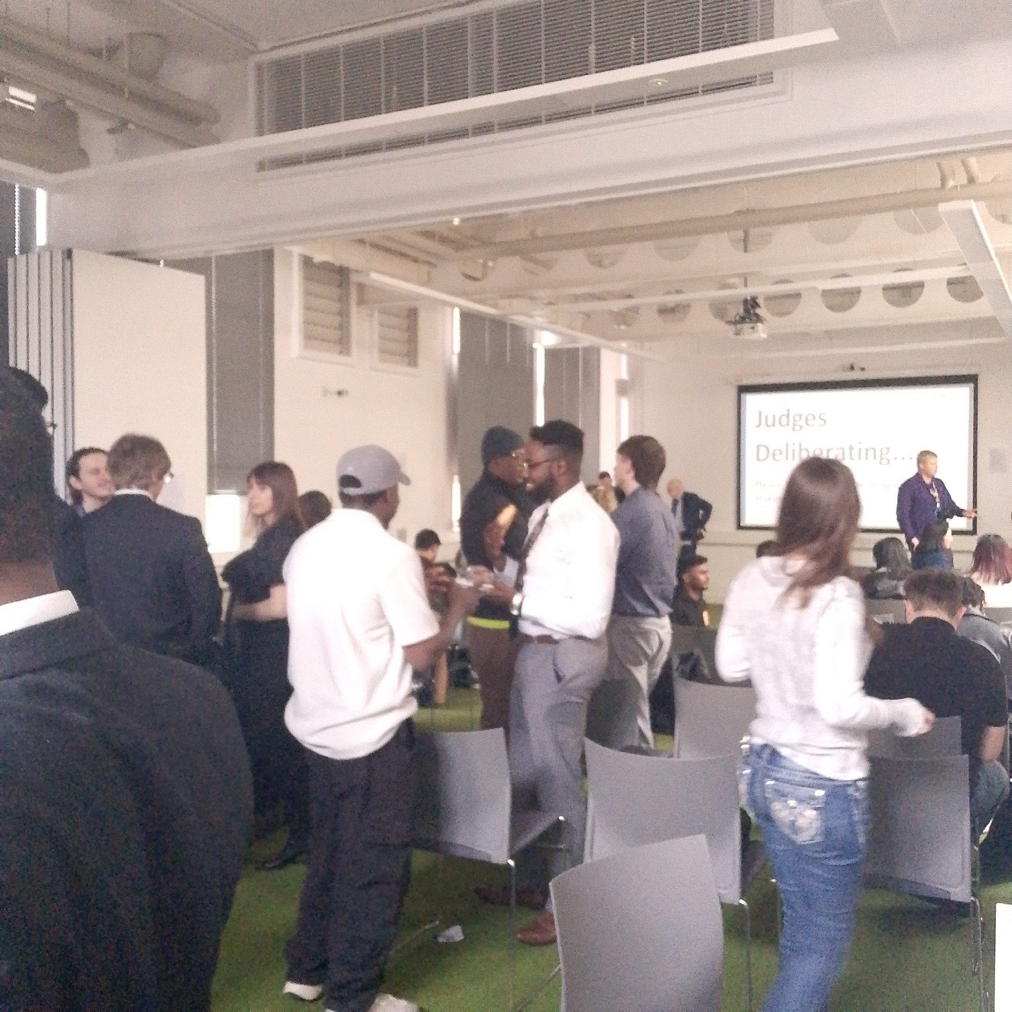 This image depicts an indoor event scene within a spacious, brightly lit venue in Coventry, United Kingdom. The room features a high ceiling with exposed white ventilation ducts and structural beams. Approximately 25 individuals, predominantly young to middle-aged adults of mixed genders and ethnicities, are visible. Many are standing in small groups, engaged in conversations, suggesting a networking period or a pause in an organized event. Attire varies from business casual, including suits and collared shirts, to casual wear such as t-shirts and jeans. In the background, a large white projector screen displays the text "Judges Deliberating...". A male in a purple collared shirt stands to the right of this screen, facing the room and gesturing with his right hand. A ceiling-mounted projector is positioned above the screen. Numerous grey, modern-style chairs are arranged in rows across a distinctive green carpeted floor; some are occupied, while many remain empty. The overall environment suggests a contemporary event space, likely during a competition or judging process.