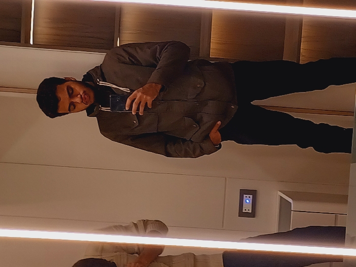 A person with dark hair and a jacket is taking a selfie in a mirror. The reflection shows another person with lighter clothes. A light switch is visible on the wall behind. The room appears to be modern, with sleek lines and a warm light source. The floor is not visible.