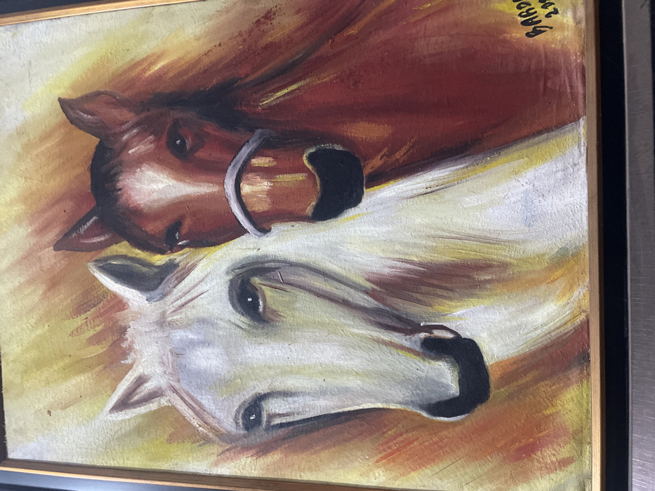An oil painting depicts two horses, one brown and the other white, overlapping