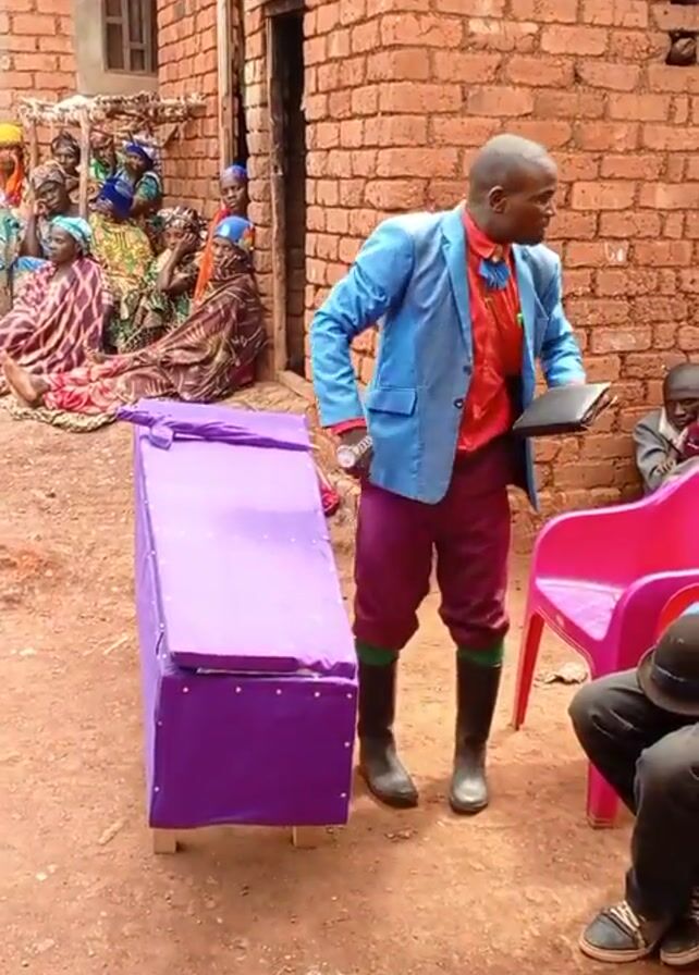 The video depicts an outdoor gathering next to a red brick building. A man in a blue blazer, red shirt, purple pants, and black boots stands near a purple, box-like object that might be a coffin. He gestures with a black book toward a pink plastic chair, then moves it to an area where people are seated in chairs. The seated individuals, mostly men and women, are dressed in a mix of casual and formal attire. The environment appears to be a yard or courtyard with dirt ground. Some of the people sitting behind the door are wearing colorful headscarves.