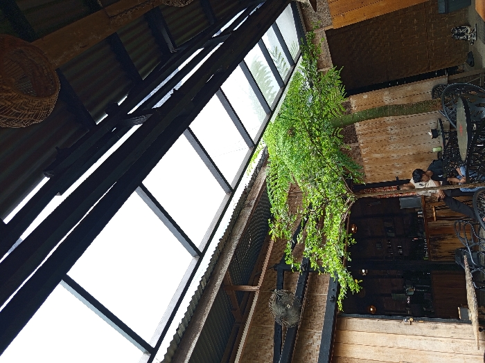 An interior view looks up at a pitched roof with large windows set in dark metal frames. A green plant hangs down, its leaves reaching towards the foreground. Below, portions of a room are visible, including wood walls, a table with people seated, and decorative wrought iron details. The scene is a mix of modern architectural elements and natural plant life within an indoor space.