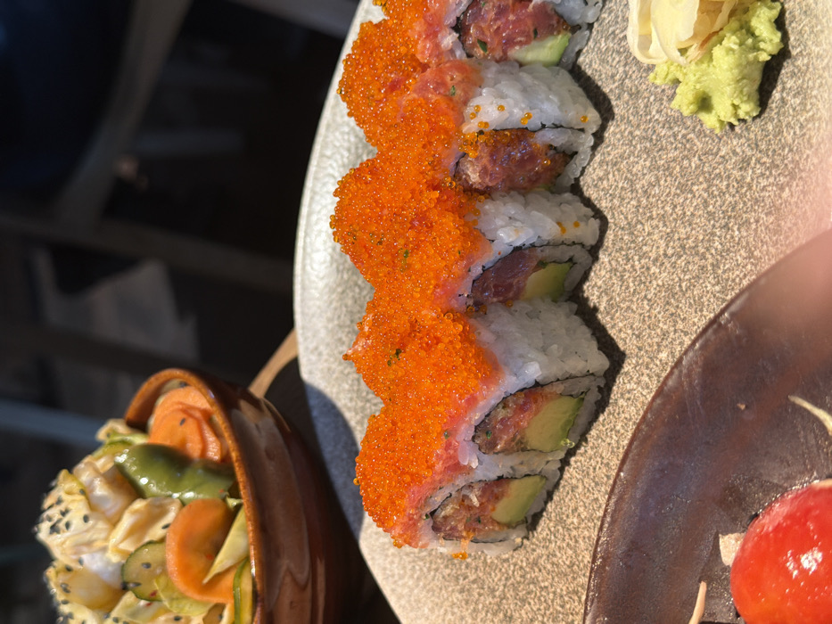 The image depicts a close-up view of food arranged on a table within a restaurant setting in Kiryat Ono, Israel. The primary subject is a line of six sushi rolls on a light brown, textured plate. Each sushi roll is an uramaki type, featuring white rice on the exterior, filled with dark red chopped fish (likely tuna) and sliced avocado, and generously topped with small, bright orange tobiko or masago roe. To the bottom right of the sushi plate, a small portion of green wasabi paste and several slices of pickled ginger are visible. In the mid-ground, to the left, a small, dark brown bowl contains a salad or pickled vegetables, including sliced carrots, green peppers or cucumbers, and light-colored vegetables topped with black sesame seeds. A partial view of another dark brown plate is visible in the bottom left corner, holding a small red, spherical item. The background is blurred, showing indistinct dark shapes consistent with restaurant furniture like chairs and tables. No individuals are visible.