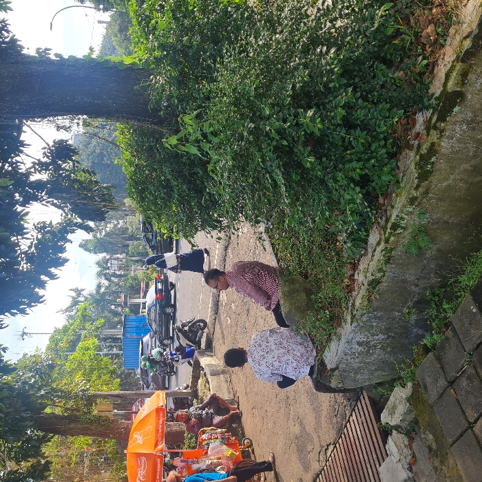 A roadside scene shows a row of parked cars and motorcycles along a street lined with trees and greenery. Two men, dressed in patterned shirts, are crouched near a small concrete barrier beside dense foliage. Further down the street, a small vendor stall with an orange umbrella is set up, surrounded by people sitting or lying down. The perspective of the shot is at a slight angle with the scenery leading into the distance.
