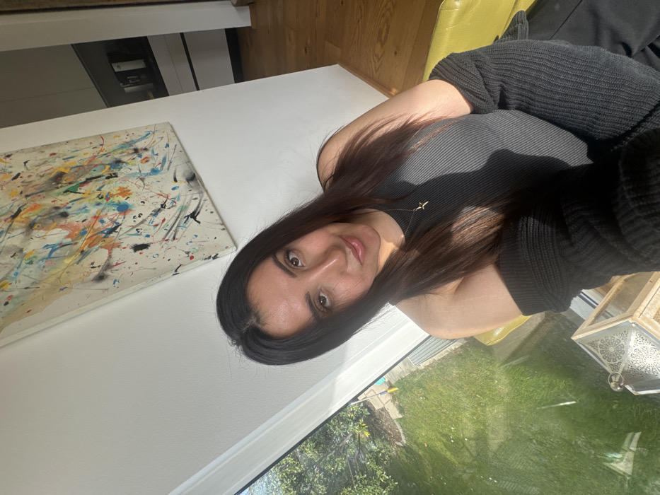 A female individual is depicted seated indoors within a residence located in Baden, Austria. She possesses long, dark hair and light brown eyes, and is looking directly at the camera with a faint smile. Her attire consists of a dark gray ribbed tank top and a black knitted cardigan worn off her shoulders. A gold-colored necklace with a star-shaped pendant is visible on her chest. The background on the left features a large window offering a view of an outdoor garden area with green grass and a blue object on the ground. A white decorative lantern is partially visible on a surface below the window. Above, on a white wall, a rectangular abstract painting with numerous multicolored paint splatters on a white background is mounted. To the right, a partial view into an adjacent room reveals white walls, a light wooden floor, and modern white kitchen cabinetry with dark appliances. A portion of a yellow furniture item is visible on the right side of the frame. Strong natural light originates from the window, casting a distinct shadow across the subject's upper body.