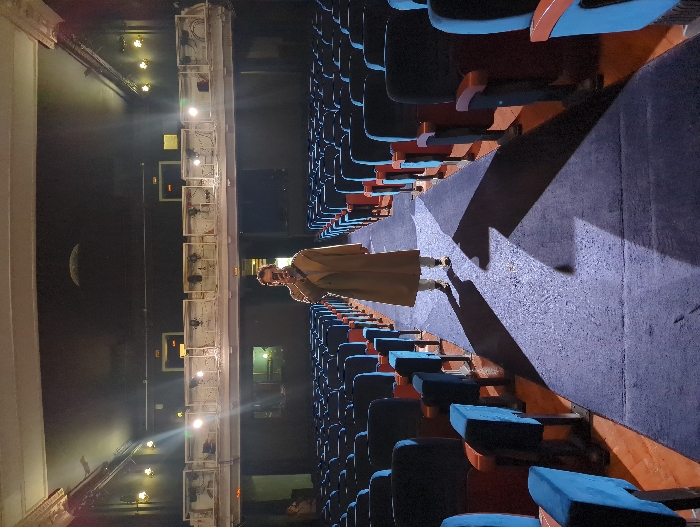 An adult individual stands centrally in the main aisle of the empty Sovremennik Theatre auditorium, located at Chistoprudny Boulevard, Moscow, Russia. The person, dressed in a light brown trench coat, light trousers, and dark shoes, holds a dark-colored smartphone raised to capture an image, facing the camera. The auditorium is characterized by numerous rows of unoccupied dark blue seats with reddish-brown wooden armrests, extending towards the unseen stage. A prominent white, ornate, and somewhat weathered balcony railing spans the upper section of the seating area. The dark ceiling features a distinct semi-circular decorative element. Bright lights, likely house or stage lights, illuminate the scene from the front, casting long, stark shadows of the individual and the seats onto the dark blue carpeted aisle. Multiple exit doors with visible signage are located below the balcony level. The overall environment presents a vintage theater interior with a distinct, somewhat grand, aesthetic.