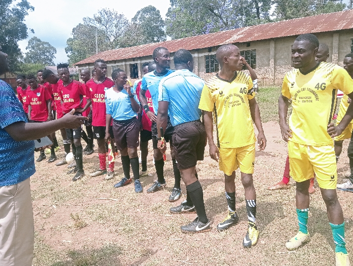 Two soccer teams and the referees gather on a grassy field, with a building visible in the background. One team wears red jerseys with the text "CLEO SALAH" printed on them. The other team wears yellow jerseys with a "4G" logo and the text "LAGO BU-C.NT TOURNAMENT 2023/2024-3 EDITION" displayed. The referees are in light blue jerseys. A man in a blue patterned shirt stands at the front of the group.