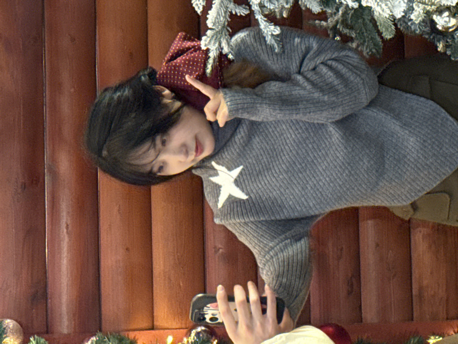 An East Asian female individual is depicted indoors, posing for a photograph. She stands against a background of horizontal reddish-brown wooden paneling. Her dark hair is styled short, and a red fabric with white polka dots is visible as a hair accessory at the back of her head. She wears a grey ribbed knit turtleneck sweater featuring a white star appliqué on the upper left chest. Her right hand is raised, forming a "V" sign with her index and middle fingers. A separate, light-skinned hand on the left side of the frame holds a black smartphone with a colorful, likely cartoon-themed case, pointed towards the subject. Portions of decorated Christmas trees are visible on both the left and right sides, adorned with spherical ornaments (red on the left, gold on the right) and white flocking. The scene is located in Liangjiang, China.