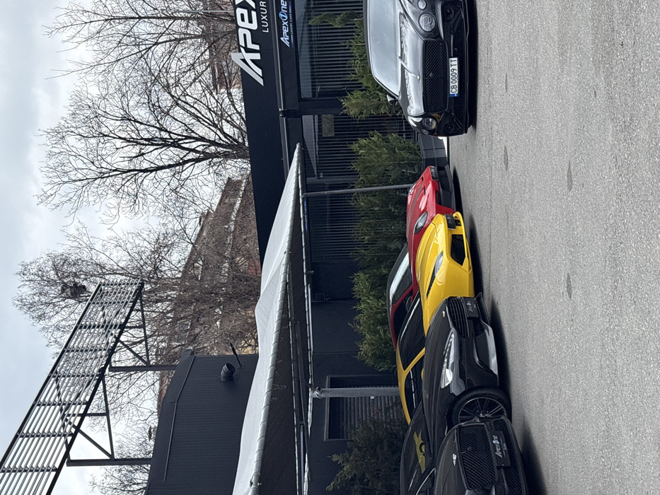 The scene depicts an outdoor parking area in front of a luxury car dealership or rental service named "ApexOne Luxury Cars" in Sofia, Bulgaria, as indicated by the license plate CB 0009 TT and the business signage