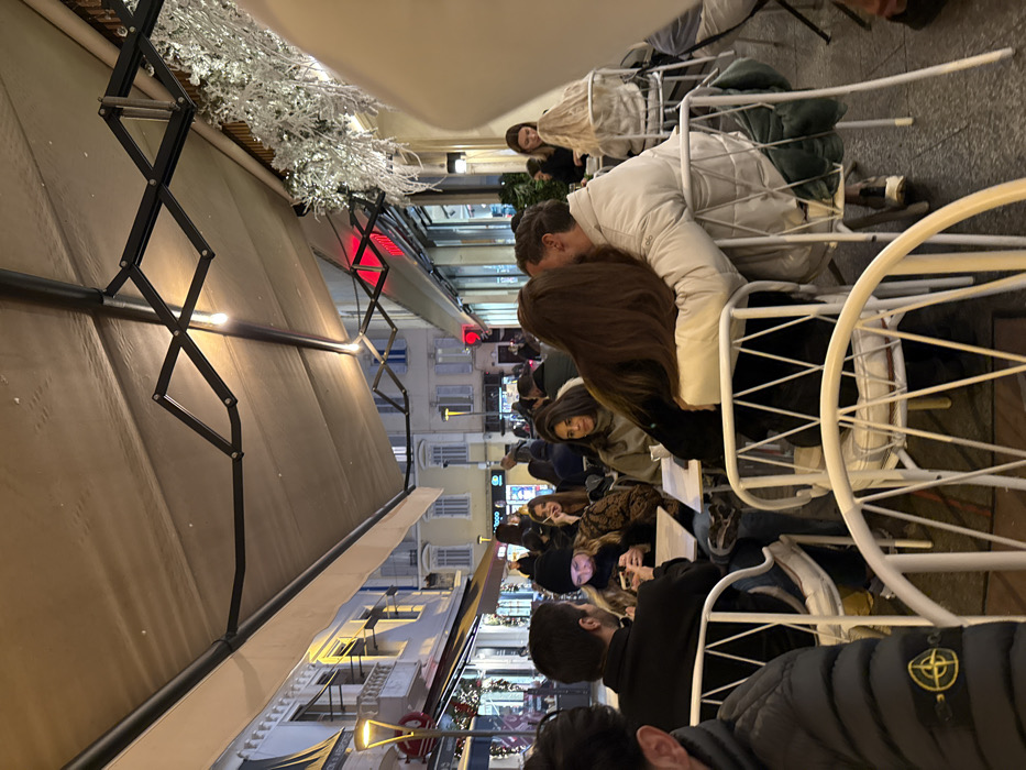 An outdoor café scene with people seated at tables under an awning. The tables are narrow and white, with matching chairs. Overhead, there's festive decor, possibly holiday-related. People are dressed in winter coats and are engaged in conversation. The setting seems to be a busy street with building facades visible in the background. A couple is embracing. The overall atmosphere appears lively and social.