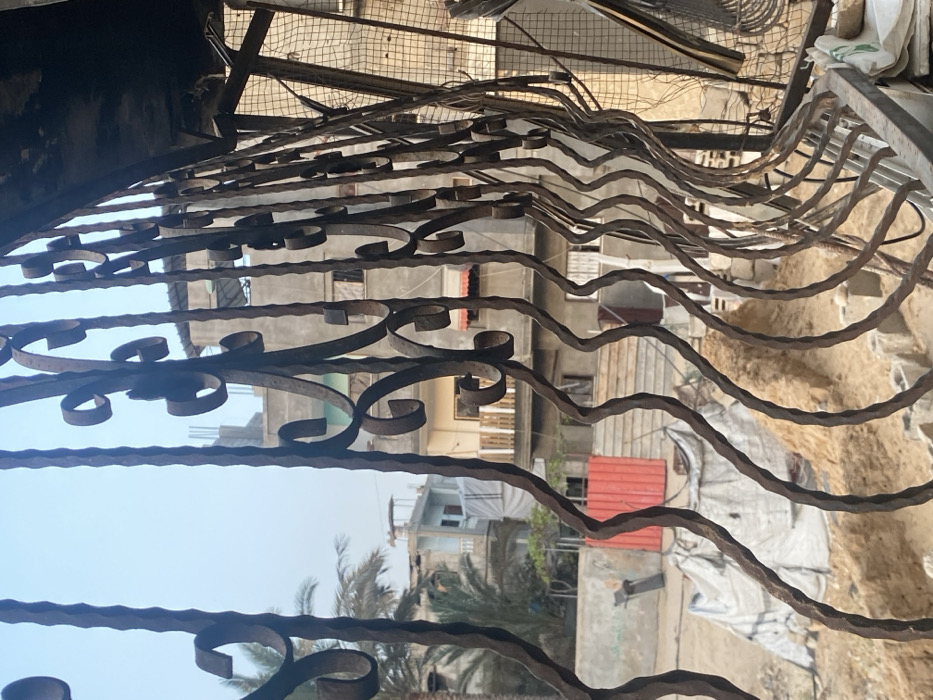 The image depicts a static daylight scene from an elevated vantage point in Khan Yunis, Palestinian Territory, offering a view over a residential and semi-industrial landscape. The immediate foreground is dominated by a heavily rusted, dark brown wrought iron balcony railing, featuring decorative, twisted vertical bars that partially obscure the view. The rightmost section of the railing appears bent and incorporates a damaged metal frame with wire mesh. A light-colored bag is visible at the bottom right of the frame. The midground, at ground level, features a large pile of light-brown sand/dirt in the lower-middle and right. To its left, a white tarp covers an indistinct mound. Behind these elements, a red rectangular metal structure, possibly a container or gate, is positioned against a low concrete wall. Scattered debris and what appear to be concrete blocks are visible on the bare ground. The background consists of various multi-story residential buildings under a hazy, light-blue sky. On the left, several palm trees are visible alongside light-colored buildings. In the center and right, an assortment of concrete structures, some appearing partially constructed or damaged with exposed rebar, are present. A cream-colored building with a small red awning is also discernible. No individuals or active events are present within the scene.