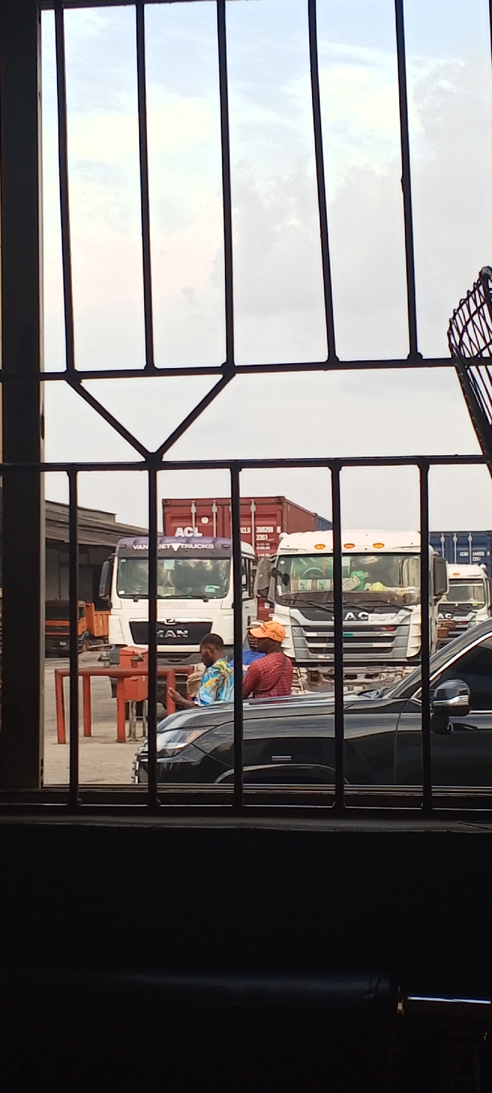 The image displays an outdoor scene in Akure, Nigeria, viewed through a dark, metal-barred window. The window frame, featuring a distinctive central inverted 'V' section, occupies the immediate foreground. In the mid-ground, two adult males are seated casually. The male on the left wears a light-colored, patterned shirt (blue, white, yellow) and is holding a small object. The male on the right wears an orange cap and a reddish-brown plaid shirt, looking left. They are positioned near a low, red-colored square table or platform. Behind them, several large trucks and shipping containers are visible in a depot or yard setting. A prominent white MAN truck, displaying "VANJET TRUCKS" and "ACL" branding on its cab, is positioned behind the seated individuals. To its right and slightly behind, a red shipping container marked "ACL KLU 288288 22G1" is observed. Additional white trucks and a blue shipping container are partially visible further right. A dark-colored sedan is parked in the lower mid-ground, its roof and upper body visible just above the bottom window bar. The sky above is overcast with light cloud cover.
