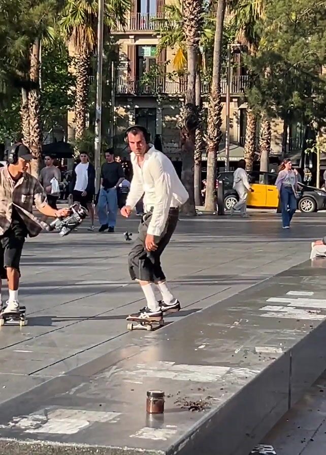 Two male skateboarders are performing tricks on a gray stone ledge in a bustling outdoor plaza. The first skateboarder, dressed in a white shirt and dark trousers, successfully executes a board slide. Simultaneously, the second skateboarder attempts a trick, with a man filming the action. The plaza is filled with people walking, sitting, and watching, set against a backdrop of buildings and palm trees under a clear blue sky. A yellow taxi is parked in the background.