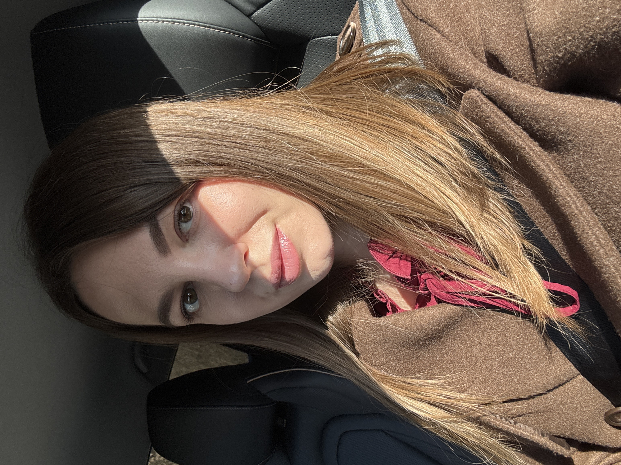 woman with light brown hair wearing a brown coat and a red scarf. She appears to be sitting in the backseat of a car. The location is unknown.