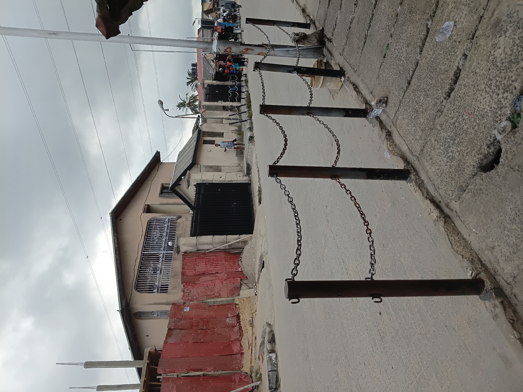 n urban street scene in Ado, Nigeria. A building is on the left, partially obscured by red construction materials. A series of metal posts connected by chains runs along the edge of the road. A few people are visible in the distance on the street. Debris litters the edge of the pavement. Utility poles and wires are overhead. The sky is overcast.