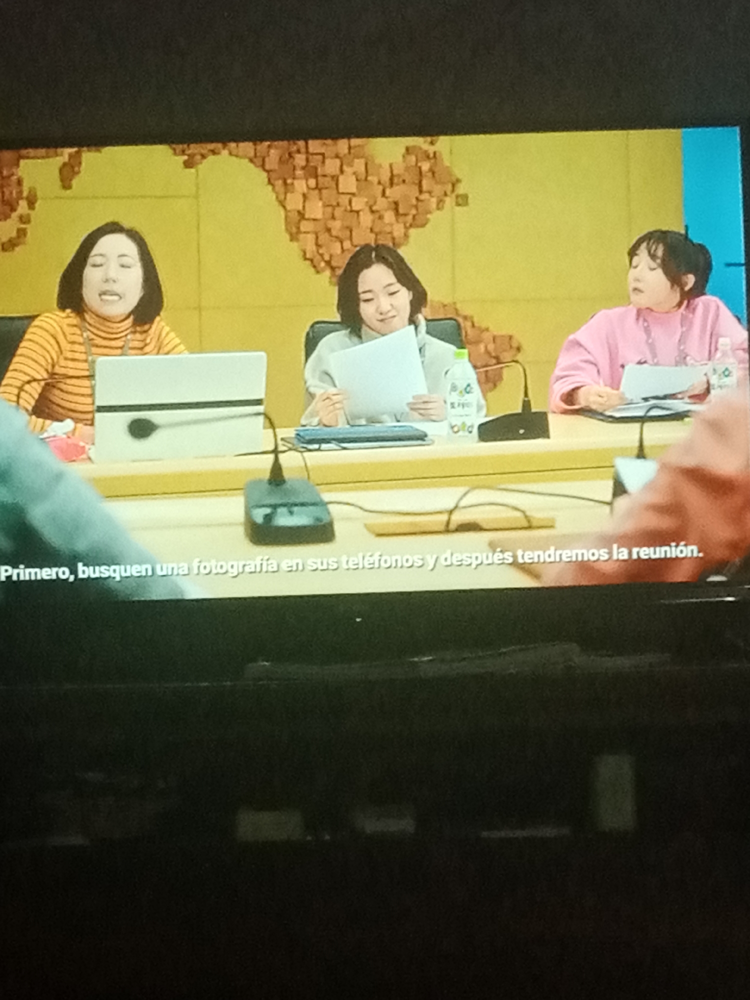Three Asian women are seated at a long table in front of a backdrop resembling a world map constructed from orange blocks. The woman on the left wears a yellow and orange striped shirt, and a laptop sits in front of her. The woman in the middle wears a light gray shirt and is holding a document. A bottle of water is positioned to her right. The woman on the right is wearing a pink sweater and also has a document in front of her, with a water bottle to her right. Each woman has a microphone placed in front of them on the table. The bottom of the image contains Spanish text: "Primero, busquen una fotografía en sus teléfonos y después tendremos la reunión." The location, Tinaquillo, Venezuela, cannot be confirmed from the provided image.