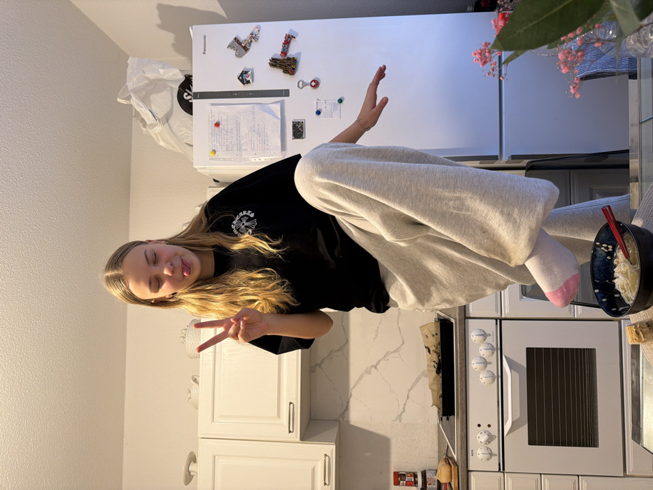 A young female, with long blonde hair, stands in a kitchen located in Blankenfelde, Germany. She is wearing an oversized black t-shirt with a white graphic on the chest, light gray wide-leg sweatpants, and a white sock with a pink toe cap on her right foot. Her left arm is raised, forming a "peace sign" with her fingers. Her right leg is bent and raised high, with her foot pointing downwards, suggesting she is balancing or posing on an unseen surface like a chair or stool. Her eyes are closed or squinting, and her tongue is extended from her mouth. The kitchen features white upper cabinets with silver handles. A light-colored countertop with a white marble-patterned backsplash is visible. On the countertop to the left, a black baking tray containing dark material (possibly baked goods) rests on a white stovetop. A white oven with four control knobs is situated below the stovetop. A wooden cutting board with a bread roll and a jar of "Nutella" are also present on the left counter. To the right, a white Panasonic two-door refrigerator is adorned with various magnets, including a Swiss flag bottle opener and several souvenir magnets. A paper note is affixed to the refrigerator with red and yellow pushpins. A white plastic bag rests on top of the refrigerator. In the immediate foreground, on a glass-top table with a circular woven placemat, a dark blue bowl filled with noodles and a red spoon is visible, along with a small piece of bread. To the far right, a partial view of a vase containing pink baby's breath flowers and green foliage is present. The ceiling is white, and the walls are a light neutral color.