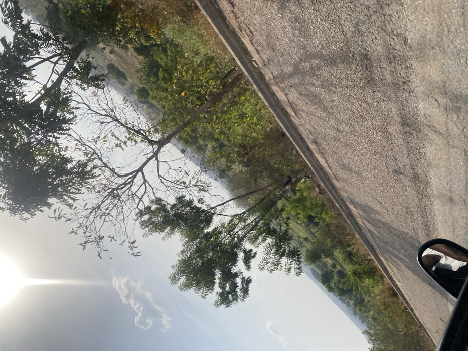 The image presents a roadside view with trees lining one side of the pavement. A large tree with sparse leaves extends across the scene. Lush greenery extends beyond the tree line, possibly leading into a valley. The road is visible on the right, and part of a car mirror is apparent on the bottom right. The sun is bright, situated on the left side, casting a hazy light. The sky is a gradient of blue and white.