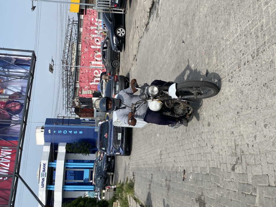 The image depicts an urban outdoor scene under bright daylight, identified as the city of Moba, Nigeria. In the immediate foreground, an adult male, wearing a grey polo shirt, dark trousers, and a black helmet with a visible chin strap, operates a white motorcycle. A white rectangular object, possibly a delivery box, is affixed to the front of the motorcycle. The motorcycle appears worn, with a visible engine, chrome exhaust, and a single round headlight. The ground consists of grey interlocking pavers, showing signs of use and minor debris. To the left of the motorcycle on the ground, a small, dark object resembling a knife or tool is visible. In the mid-ground, a paved road stretches into the distance, populated with several vehicles. These include a dark blue SUV with a visible Lagos license plate (KSF-683-GX) and multiple dark-colored sedans and SUVs, suggesting moderate traffic. The background is dominated by commercial structures and signage. To the left, a blue and white "LOTUS BANK" building with distinctive vertical column-like features is visible. Adjacent to it, a tall blue structure displays the white numbers "5045#" vertically. Further right, a building is partially obscured by a large, tattered red banner bearing the white text "hello lekki". Overhead, a large billboard with partial text, including "MAZING" and images of people, spans across the upper frame. The sky is clear and bright blue. Utility poles with overhead lines and solar-powered streetlights are also present. Sparse green vegetation is visible along the left edge of the road. Shadows are cast by objects, indicating a high sun position.
