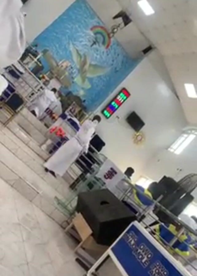 The video depicts the interior of a church or religious building. Several people wearing white robes are visible in the space. The camera is angled upward, providing a view of the high ceiling which has a mural of white doves and a rainbow against a light blue sky. A digital clock is mounted on the wall displaying the time. The floor is tiled. In the foreground, there's a blue and white sign. Some chairs are placed around the room. One individual in a white robe is standing and appears to be praying or gesturing in a religious manner. Overall, the scene suggests a religious service or event taking place in a church.
