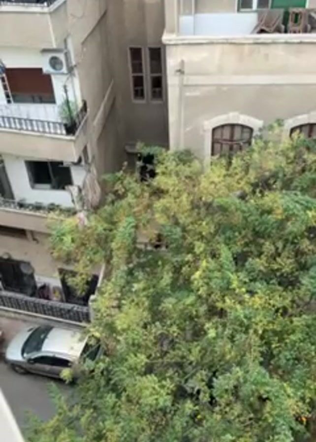 street scene with buildings, trees, and a parked car. A cat appears from behind the tree in the foreground, sits for a moment, and then disappears behind the tree again.