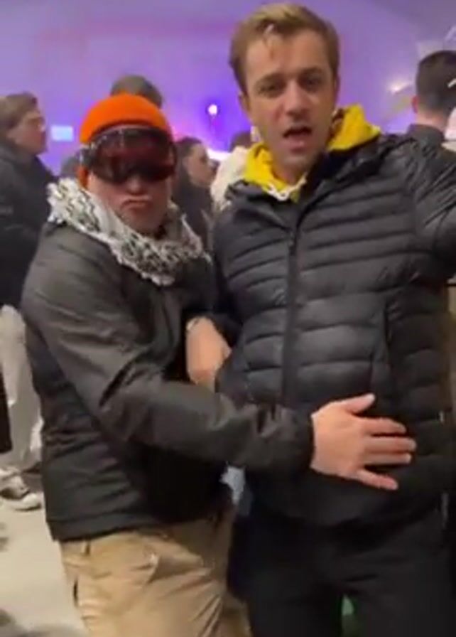 Two young men are dancing at what appears to be an indoor music festival or party. The man on the left wears an orange ski hat and goggles, a black jacket, a scarf, and khaki pants. He sticks his tongue out. The man on the right wears a black puffer jacket with a yellow hoodie underneath, and black pants. Both men make hand gestures. The scene is brightly lit with colored lights. Other people are visible in the background. The floor is a light color.