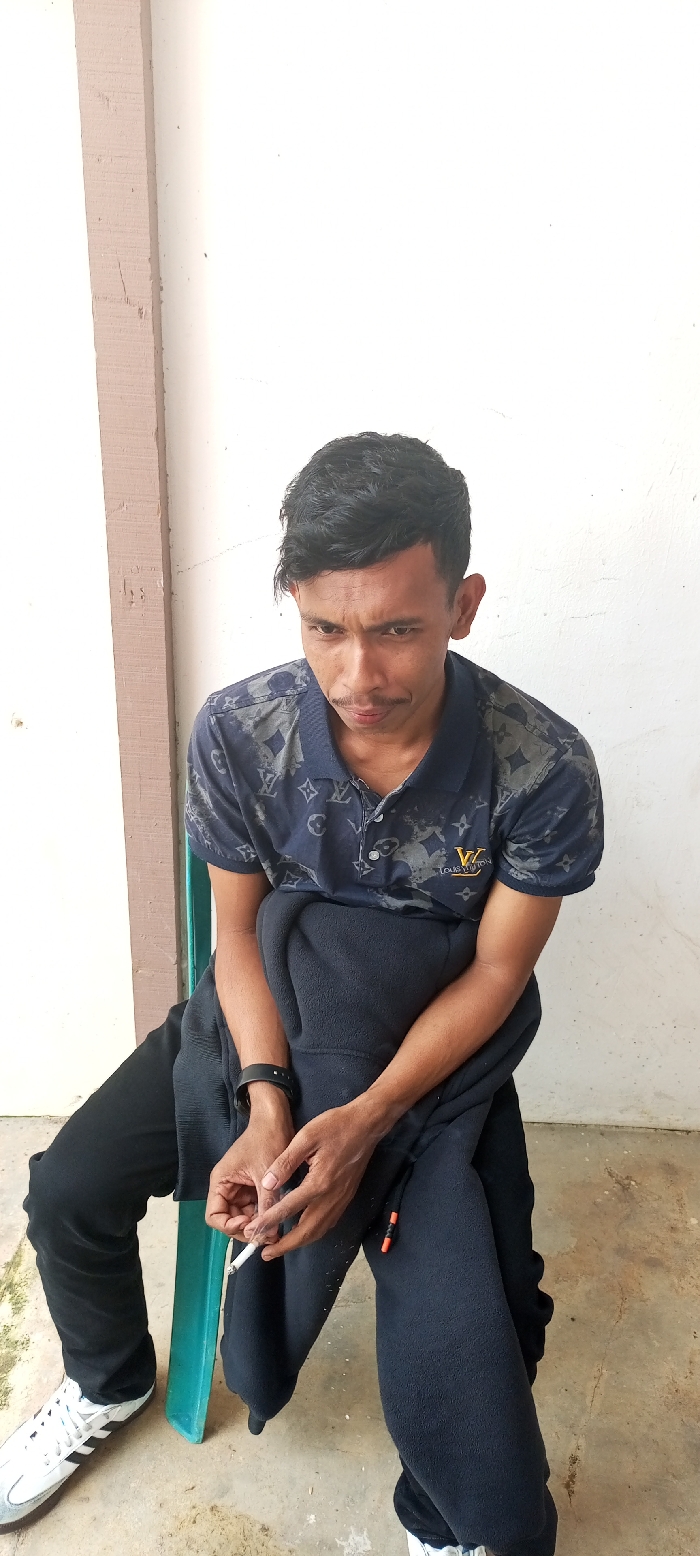 A man sits on a green plastic chair, against a white wall with a brown trim on the left. He wears a blue patterned polo shirt, black sweatpants, and white Adidas sneakers. A dark blue zip-up hoodie rests on his lap. He holds a cigarette in his right hand. His expression is somewhat pensive. He also wears a black wristband.