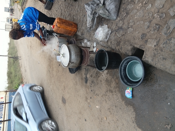 A person in a blue shirt washes their hands over steaming pots set on burners. A blue car sits on the side of the street. Black buckets and a plastic bag rest nearby. A brown container is on the ground next to the pots. A large canvas bag is against the curb.
