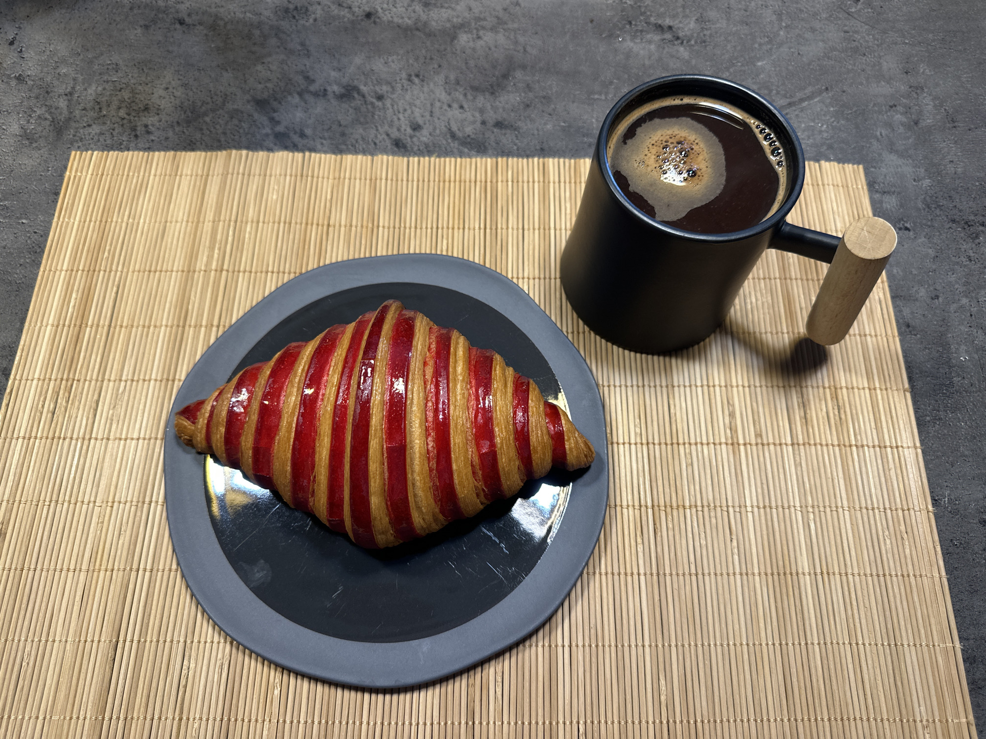 The image displays an overhead perspective of a culinary arrangement. A croissant, characterized by alternating golden-brown pastry layers and glossy red glaze stripes, is centered on an irregularly shaped dark grey ceramic plate with a reflective interior surface. To the lower right, a matte black ceramic mug, fitted with a light-colored cylindrical wooden handle, holds a dark beverage topped with light-brown crema and small bubbles. Both the plate and mug are positioned upon a light-brown woven bamboo mat. The background surface, visible beyond the mat, is dark grey and textured. No individuals or specific identifying markers for a location within the city of Tbilisi, Georgia, are visible.