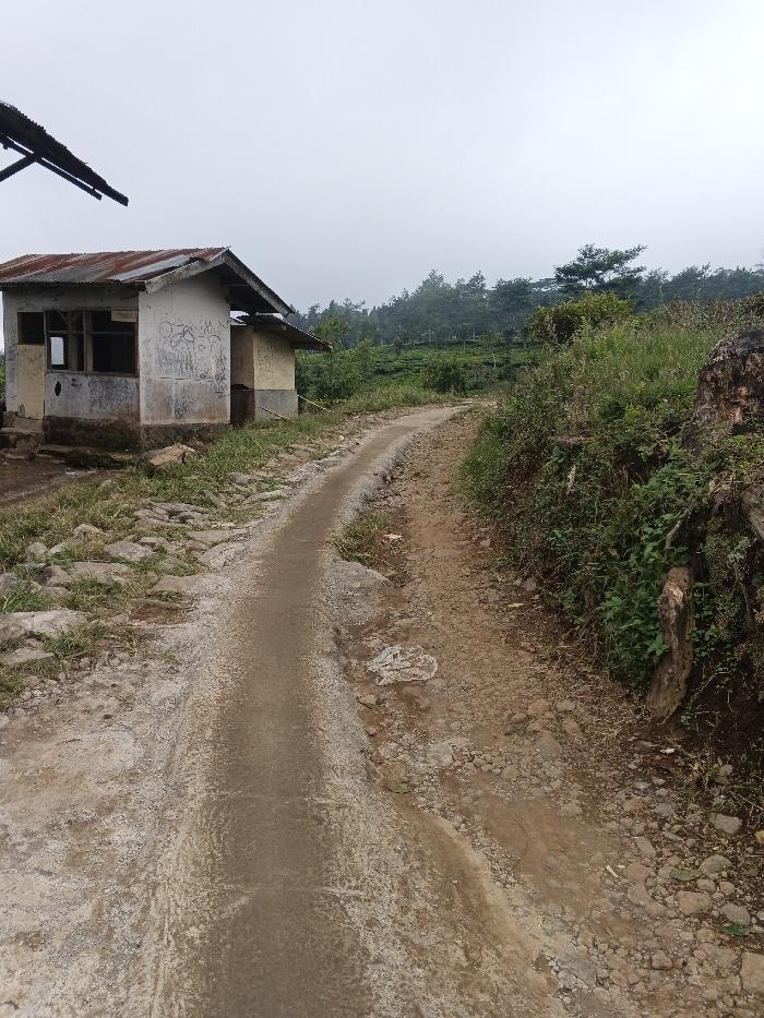 The image depicts a rural or semi-rural landscape in Pinnwe, Myanmar (Burma), under an overcast sky. A weathered, single-story structure with light-colored, stained walls and a rusted corrugated metal roof is visible on the left. The building features open window frames and graffiti or crude drawings on its front facade; a smaller, yellow-painted annex is attached to its right side. A partial view of another corrugated metal roof structure is present in the upper left corner. A dirt and gravel path, with a smoother central track and rocky shoulders, extends from the foreground into the background, curving slightly uphill to the right. Lush green vegetation, including grasses, shrubs, and a large, moss-covered tree stump or rock formation, borders the path. Dense forestry or cultivated plants cover the hills in the background. No individuals, animals, vehicles, or active interactions are present in the scene.