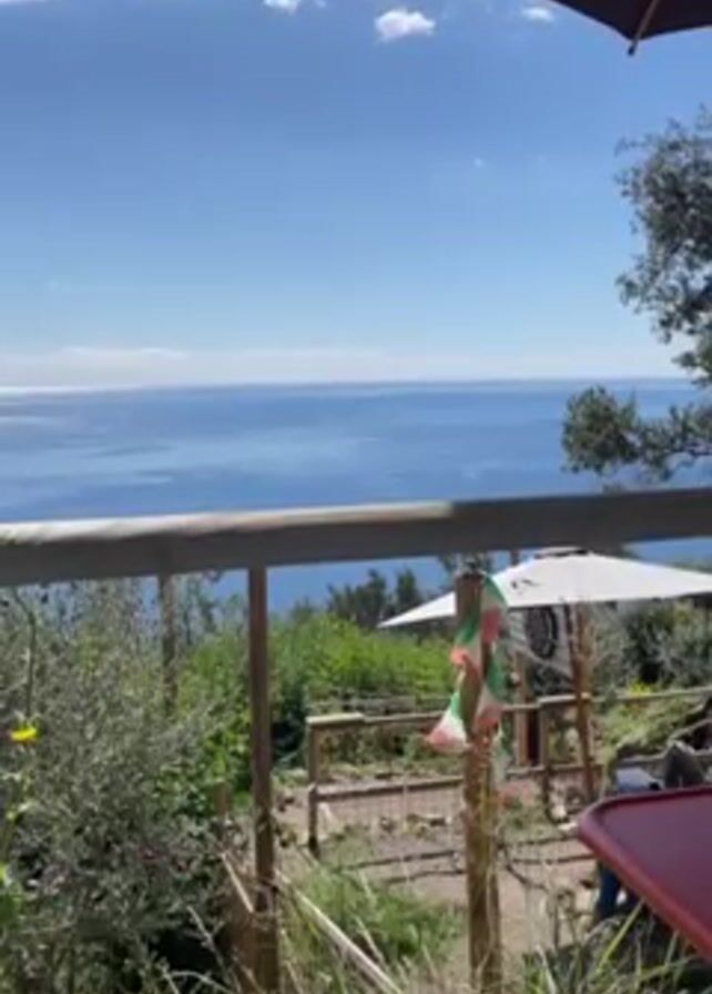 The video presents a scenic view of the sea under a blue sky, as seen from a high vantage point, likely a patio or balcony