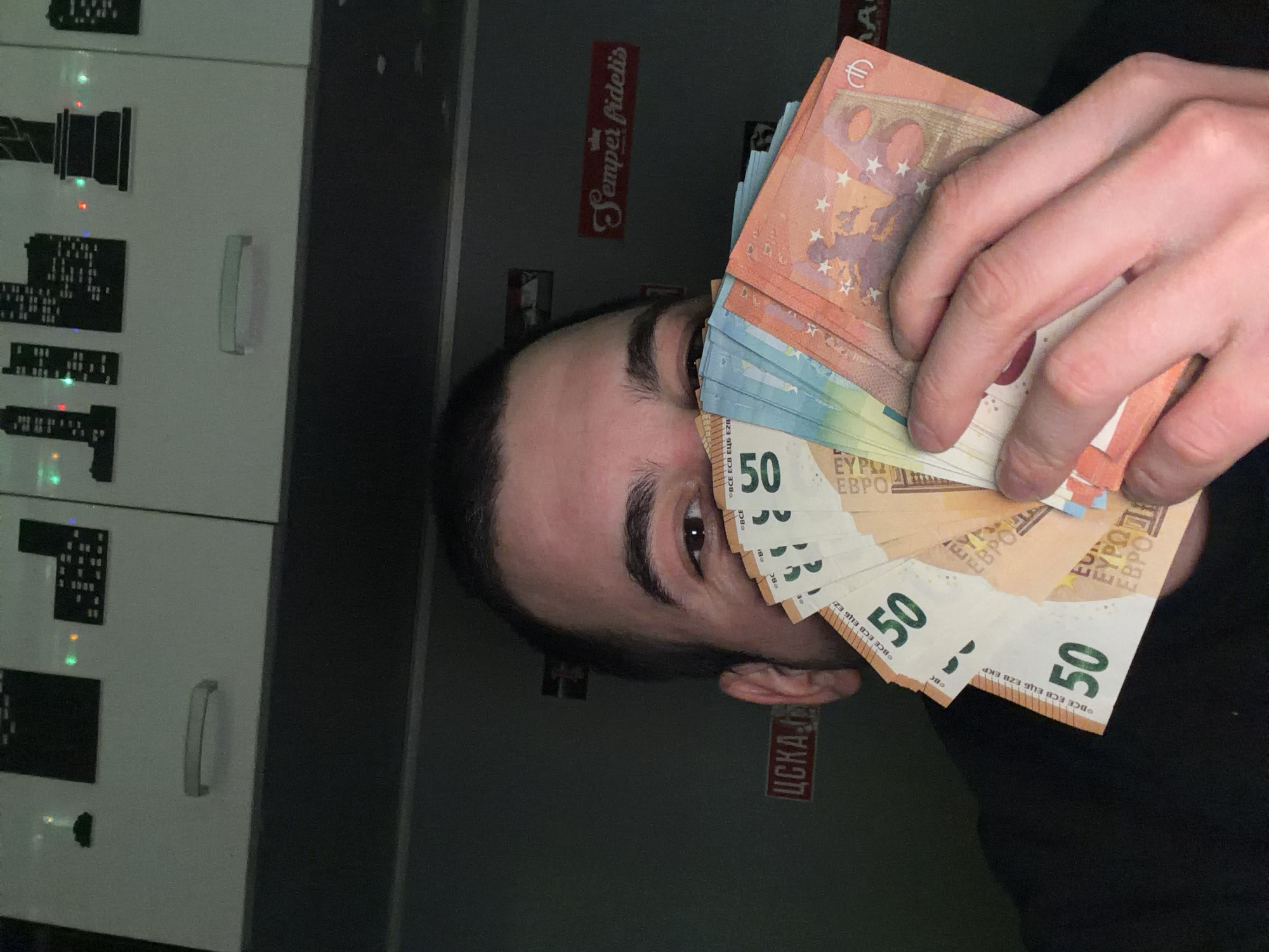 man holding a stack of Euro banknotes, primarily 50 Euro notes, close to his face, obscuring part of it. The notes are fanned out, revealing different denominations, including 20 Euro notes. His hand is visible on top of the stack. The man has dark hair and is wearing a black shirt. In the background, there is a white cabinet with black, graphic-style decorations, possibly representing city buildings. A sticker with the text "Semper fidelis" is on the wall. Another sticker is present, with a red background and a white inscription "ЦСКА," which could suggest a fan affiliation to the CSKA sports society. The setting appears to be indoors. It is not possible to conclusively determine if the location is in Varna, Bulgaria, based on the visual information provided. The presence of the "ЦСКА" sticker, however, suggests a possible Eastern European location as CSKA is a common sports club name.