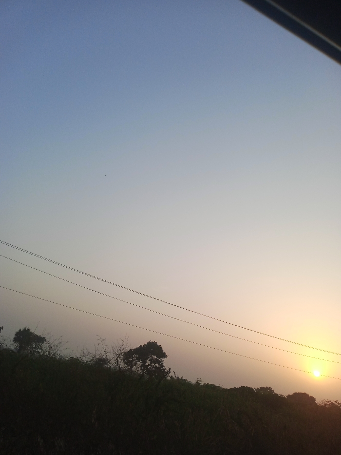 hazy sunset over a dark, silhouetted landscape of trees and foliage. The sky fades from light blue at the top to a warm, orangey-yellow near the horizon where the sun is positioned. Power lines stretch horizontally across the frame, adding a man-made element to the natural scene. A hint of an object is visible in the upper right corner.