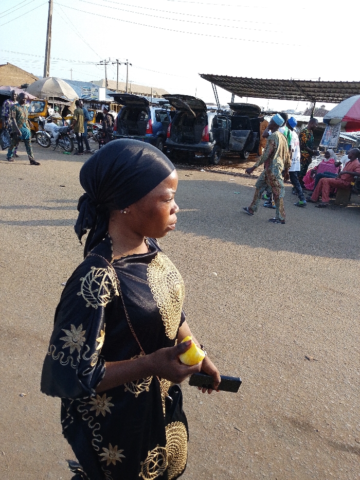 A woman in a black headscarf and dress with gold detailing stands on a paved road holding a yellow fruit and a cell phone. The background features a bustling scene: people walking and sitting, motorcycles, cars with open trunks, and vendor tents. The scene appears to be a marketplace. Overheard electrical wires are visible against a pale sky.