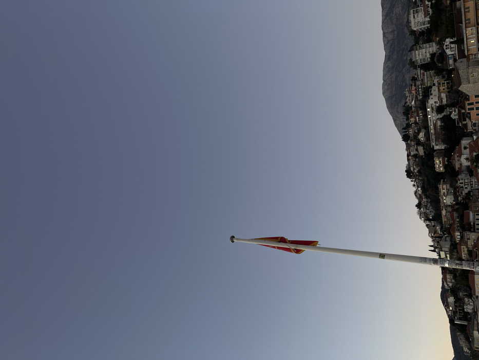 A low-angle, rotated shot reveals a flag of North Macedonia atop a tall, white flagpole against a clear, gradient sky. Buildings and a mountain are visible on the right side of the frame, creating a sense of location. The sky transitions from a deep blue on the left to a lighter hue on the right, adding depth to the scene.